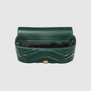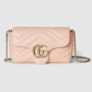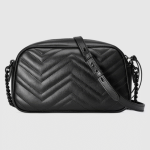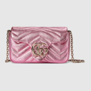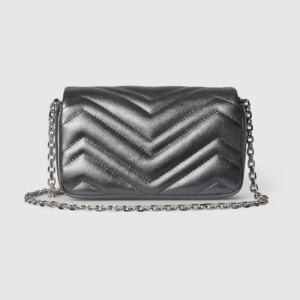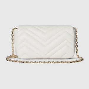 The mini GG Marmont chain shoulder bag has a softly structured shape and a zip top closure with Double G hardware. The chain shoulder strap has a leather shoulder detail. The camera bag is made in matelassé leather with a chevron design and GG on the back.