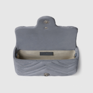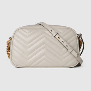 Made in matelassé chevron leather in a neutral shade of light grey, the GG Marmont small camera bag has a softly structured shape and a flap closure with Double G hardware.