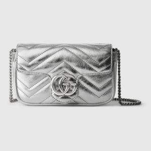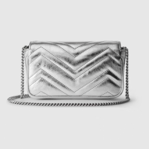 From mirrored leather to sparkling crystals, Gucci provides a range of shimmering pieces for the gifting season. Choose from printed accessories or shiny leather wallets to add a touch of style. This GG Marmont mini bag appears in silver metallic leather.