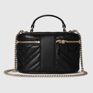 The GG Marmont, a signature collection of the House, comprises contemporary silhouettes. This vanity bag with chain highlights the archival logo, first introduced in the 1970s.