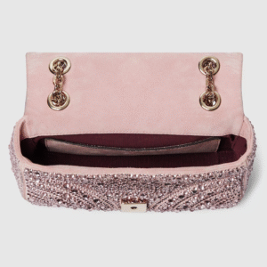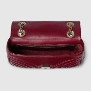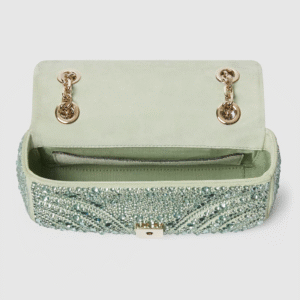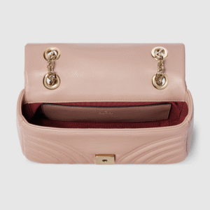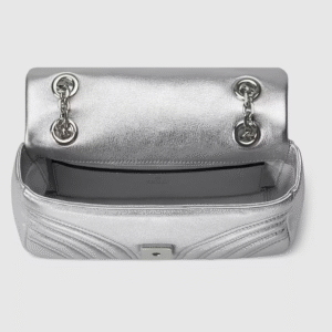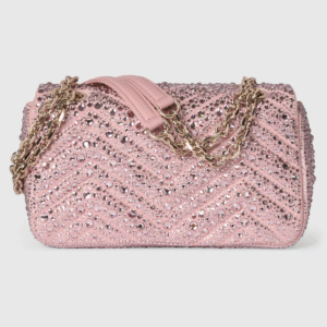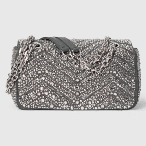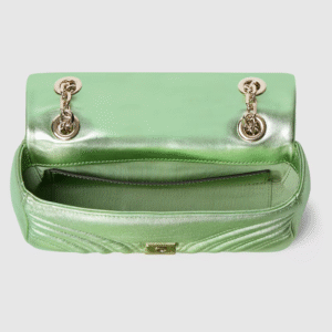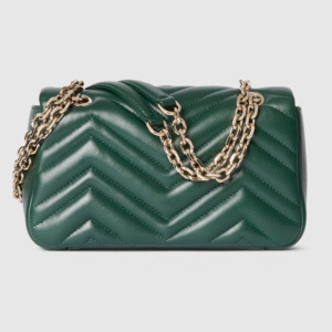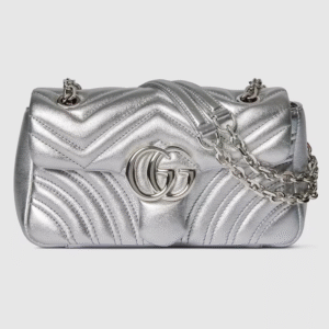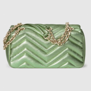 In the Fall Winter 2025 collection, the GG Marmont, a signature collection of the House, features the emblematic Double G, a faceted chain strap, and a soft, structured silhouette. This style is crafted from soft lightweight matelassé chevron leather and comes with a tonal enameled hardware and chain.