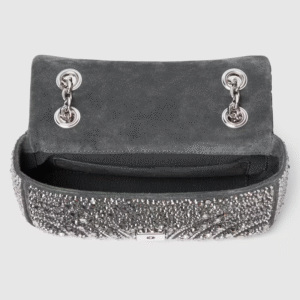 From mirrored leather to sparkling crystals, Gucci provides a range of shimmering pieces for the gifting season. Choose from printed accessories or shiny leather wallets to add a touch of style. This GG Marmont mini bag appears in silver metallic leather.