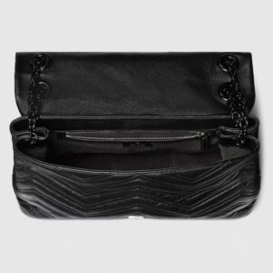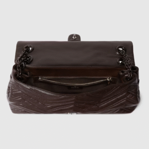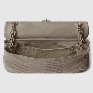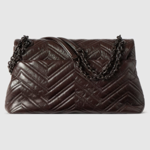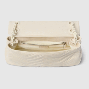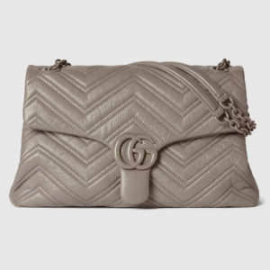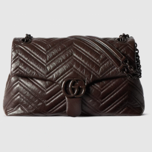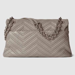 In the Fall Winter 2025 collection, the GG Marmont, a signature collection of the House, features the emblematic Double G, a faceted chain strap, and a soft, structured silhouette. This style is crafted from soft lightweight matelassé chevron leather and comes with a tonal enameled hardware and chain.
